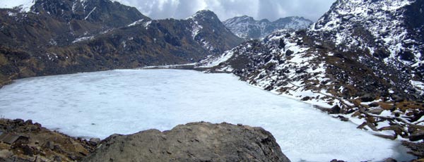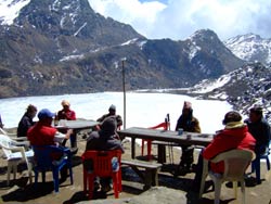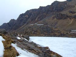 | 12:00 ゴサインクンダ(4380m)到着。 二つの湖を分ける小高い台地のうえに4軒のロッジが建っている。 ゴサインクンダ湖は凍りつき、周りは雪だらけ。この湖にはヴィシュヌ神が眠っているといわれ、ゴサインクンダはヒンズーの大切な聖地である。湖の傍に立派な祠があり、リンガとヨニが祀ってある。8月の大祭には全国から巡礼に来るという。 |