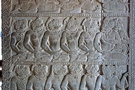 砂岩のテラスを通って東門から第一回廊に入る。回廊は屋根が失われているので壁みたいだけれど、一面に彫られたレリーフが素晴らしい。