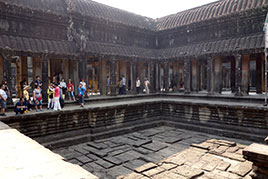 環濠を渡り、西塔門と呼ばれる大きな門をくぐる。中央3つの門の尖塔上部は崩壊しているが堂々たる石造建築だ。左右に回廊が伸びて、壁面に疑似連子窓が並んでいる。両端に象の門と呼ばれる段差のない門が配置され、象や荷車はここを通ったそうだ。