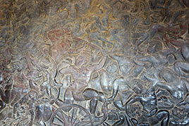 東門テラスから第一回廊に入り、今日は南面東側のレリーフを観た。ここにはクメール軍がチャンバ族に大勝したトンサレップ湖での水上戦の様子と、炊事、狩り、出産、大工仕事等日常生活が細かく描かれていて、とてもおもしろい。バイヨンでもっとも見ごたえがある、との評価にもうなずける。