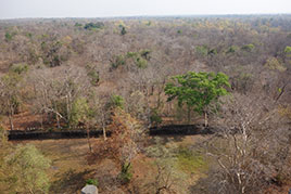 周囲四方全部、森林で埋め尽くされた平原。今は乾季で森林は緑いっぱいではないが、壮大な風景だ。 飽かず眺める。