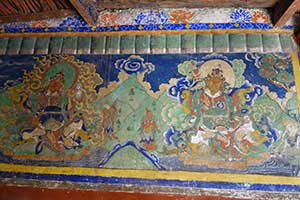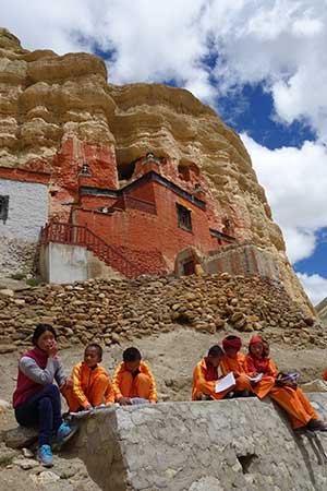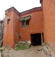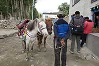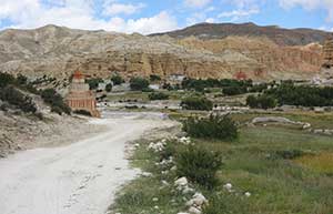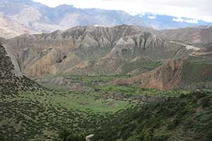 ここからいよいよアッパー・ムスタンに入る。川の対岸に村がある。灰色の大河と赤茶けた山々が連なる中にそこだけに緑が輝いている。