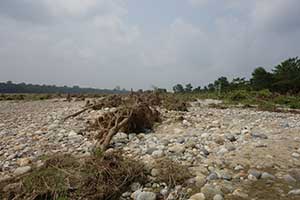 水害の跡が生々しい川辺 |